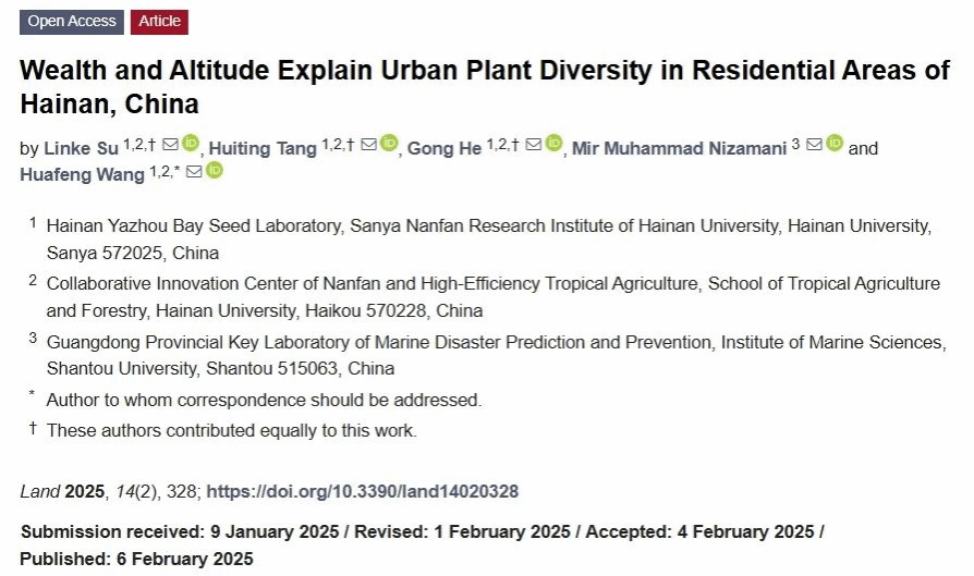 2025年2月,《Land》期刊(中科院二区期刊,IF=3.2)发表题为“Wealth and Altitude Explain Urban Plant Diversity in Residential Areas of Hainan, China”的研究论文。太阳集团tcy8722本科生苏琳珂为该论文的第一作者,王华锋教授为论文的通讯作者。本研究得到国家自然科学基金的资助。