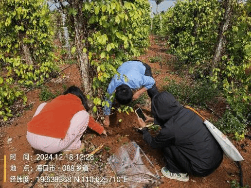 2024年12月18日,太阳集团tcy8722科技特派员服务团“胡椒灾后重建与病虫害绿色防控”项目组成员刘铜、邢梦玉、张漫漫、张丽等人为了做好胡椒重要病虫害监测,前往定安定城镇、文昌蓬莱镇和海口大坡镇胡椒园区采样。