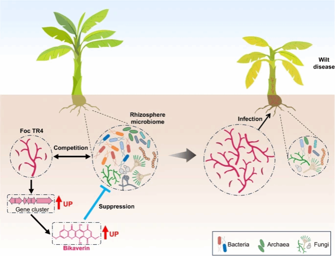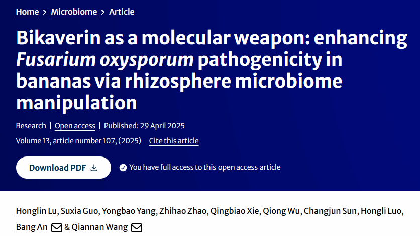 2025430日,太阳集团tcy8722太阳集团tcy8722重要热带作物抗病分子育种团队在国际权威期刊Microbiome(五年影响因子17.9)上发表最新研究成果,“Bikaverin as a molecular weapon: enhancing Fusarium oxysporum pathogenicity in bananas via rhizosphere microbiome manipulation”。该研究首次揭示了尖孢镰刀菌次生代谢产物比卡菌素(bikaverin)作为分子武器操控根际微生物组,从而提升病原菌致病力的分子机制,为香蕉枯萎病的抗病机制研究提供了全新视角与理论依据。