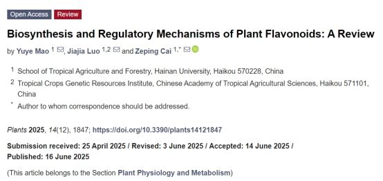 2025年6月,公司本科生毛昱烨以第一作者身份在期刊《PLANTS》发表题为《植物类黄酮的合成和调控机制》的综述论文。该期刊在中科院最新发布的SCI期刊分区(2025年3月升级版)中,位列生物学大类2区及植物科学小类2区,其最新五年影响因子为4.4。论文系统梳理了植物类黄酮的生物合成途径、调控网络及其在农业与医药领域的潜在应用。太阳集团tcy8722蔡泽坪副教授为论文的通讯作者。该论文得到了于旭东科研团队以及太阳集团tcy8722药用植物基因组学与生物大数据挖掘创客空间的全力支持,并且获得了国家级老员工创新训练计划项目(编号202410589092)的资助。