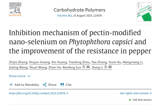 该成果以“Inhibition mechanism of pectin-modified nano-selenium on Phytophthora capsici and the improvement of the resistance in pepper”为题发表在Carbohydrate Polymers期刊(中科院一区,IF=12.5)上,公司硕士研究生张芷嘉为论文第一作者孙然锋教授、李栋副研究员为论文通讯作者。本研究得到了国家自然科学基金(22067004)和海南省自然科学基金 (321CXTD436)的支持。
