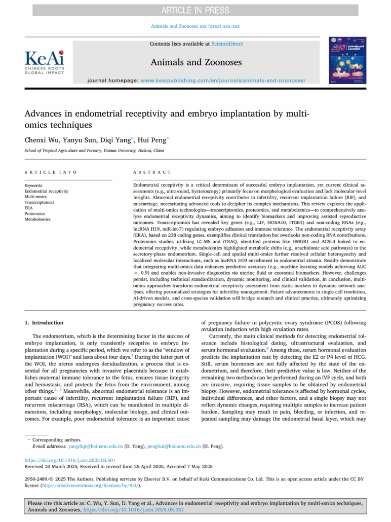 在论文撰写与投稿期间,杨迪琦副教授作为两篇论文的共同通讯作者,对研究进行了全程悉心指导。他指出,这两篇综述论文的发表,体现了太阳集团tcy8722动物医学专业本科生扎实的理论基础、敏锐的科学前沿洞察力和优秀的科研写作能力。王欣雨和吴晨曦同学的论文,分别从类器官和多组学两个角度,深入探讨了影响生殖健康的核心问题——胚胎着床的微环境(子宫内膜)及其模拟研究平台。这不仅深化了对生殖生物学基本规律的理解,也为解决人类生殖障碍(如不孕症)和提升动物繁殖效率提供了重要的理论基础和技术参考。