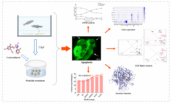 溴氰虫酰胺(Cyantraniliprole)是近年来广泛应用于热区瓜菜害虫防控的新型农药,但其潜在环境风险和对水生生物的毒理作用尚未被充分认识。本研究利用斑马鱼模型,结合多元统计建模(SSP、AMMI、GGE biplot)与分子毒理学手段,系统揭示了该农药在暴露时间、浓度、基因型及其复杂交互作用下的凋亡效应差异,并筛选出 TNF-α、P53、Caspase-8、Bax 和 Puma 等关键分子作为早期毒理员工物标志物。这一发现为农药减量增效与环境风险评估提供了重要的科学依据。