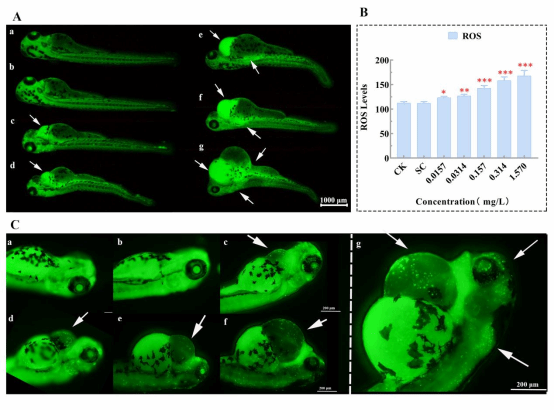 Fig. 1. Cyantraniliprole-induced reactive oxygen species (ROS) production and apoptosis in zebrafish larvae at 72 hpf.