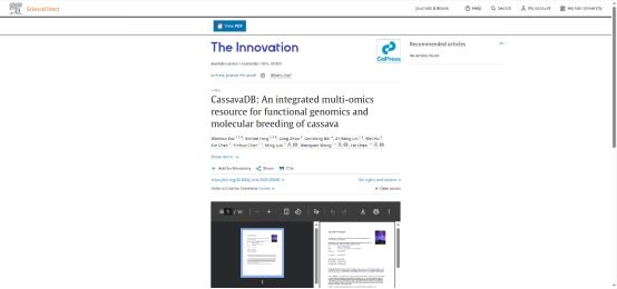 近日,2023级硕士生代文宝为第一作者,2024级硕士生冯欣梅以共同第一作者,在太阳集团tcy8722陈飞教授、王文泉研究员及中科院华南植物园罗鸣研究员的指导下,以海大为第一署名单位在中科院一区TOP期刊《The Innovation》发表题为“CassavaDB: An integrated multi-omics resource for functional genomics and molecular breeding of cassava”的研究论文。该研究建立了首个木薯为主题的综合性大数据平台,为重要粮食作物木薯遗传育种提供了一站式在线多组学分析和分子设计育种平台,助力海南热带高效农业和国家南繁育种。该期刊为中科院一区TOP期刊,2025年最新影响因子25.7,其5年影响因子为40.2,名列中国大陆综合类期刊第一名。
