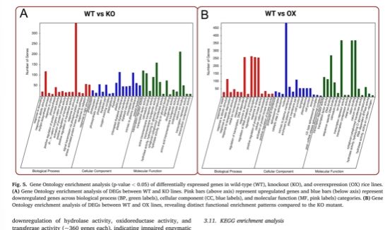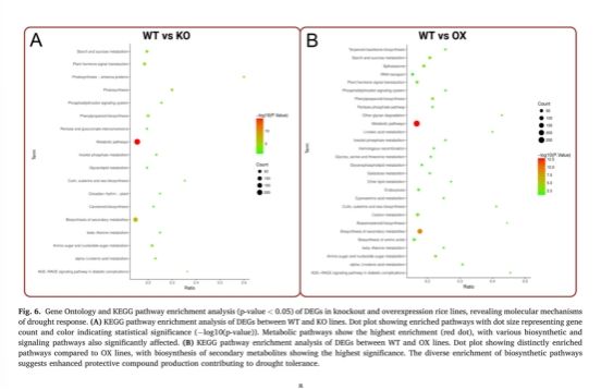 深入分析揭示,OsRAV11/12通过多种生理途径影响水稻的抗旱性。在干旱条件下,敲除株系能维持更低的气孔导度,减少水分流失,同时积累更高的脱落酸水平。这些植株还表现出氧化损伤的减轻,丙二醛含量显著降低,表明细胞膜受损程度较小。转录组分析进一步表明,敲除株系中应激响应和蛋白质折叠过程相关基因上调,而过表达株系则出现生长相关基因的不适当表达。
