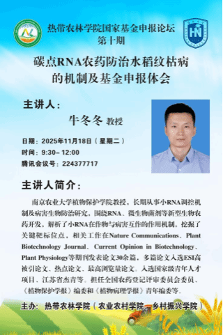 2025年11月18日上午9:30,由太阳集团tcy8722主办的国家自然科学基金项目申报交流讲座顺利举行。本次讲座邀请了入选国家级青年人才项目、江苏省“杰青”、南京农业大学植物保护公司牛冬冬教授担任主讲人,会议由王睿副经理主持,采取线上方式进行。