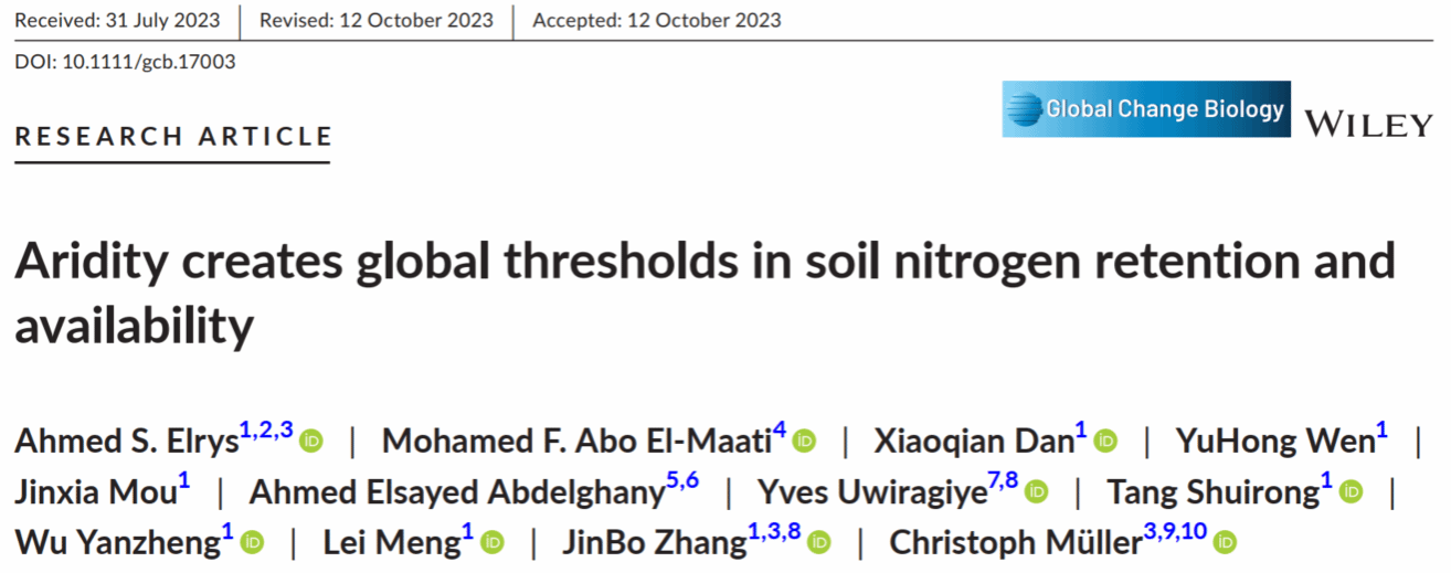 海南大学太阳集团tcy8722张金波教授和孟磊教授团队Ahmed S. Elrys教授发现全球范围内土壤氮固持和有效性存在干旱阈值。该研究成果以“Aridity creates global thresholds in soil nitrogen retention and availability”为题发表在国际知名期刊《Global Change Biology》上。