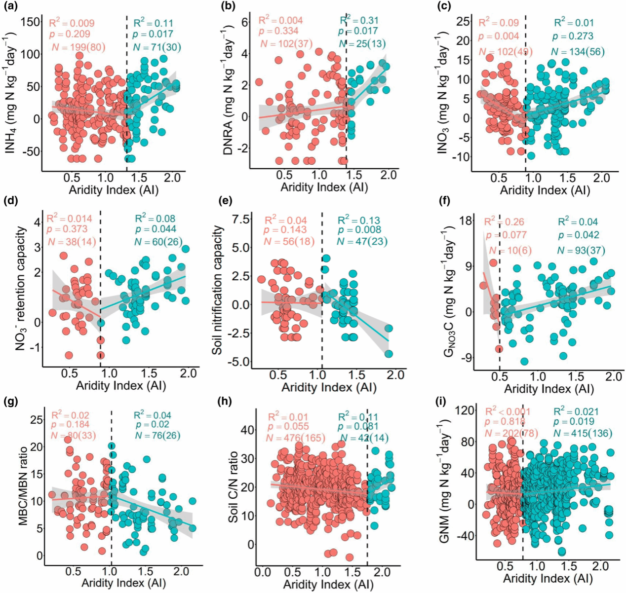 确定干旱和氮转化速率的临界点可以表征陆地生态系统对气候变化的脆弱性。全球范围内,干旱程度提高减少了土壤硝态氮的消耗,但增加了土壤硝化能力,主要原因在于土壤微生物生物量碳(MBC)和氮(MBN)的减少以及土壤pH的增加。在不同陆地生态系统中,氮产生和保持对干旱阈值的响应存在差异。农田土壤中,干旱指数小于0.8-0.9时,由于抑制氨氧化古菌和细菌群落活性,土壤初级硝化过程和硝态氮含量随干旱程度的增加而降低,高于此阈值时则相反。草地土壤中,干旱指数低于0.5时,土壤初级矿化和固定速率随干旱程度增加而降低,高于该阈值则相反。森林土壤C/N比高,干旱指数低于1.0时,干旱增加促进了土壤硝态氮的固定,但当干旱指数大于1.3时,由于土壤全氮减少和MBC/MBN比增加,导致铵态氮的固定受到抑制,干旱指数高于1.4时,森林土壤硝酸盐异化还原为铵速率随干旱程度增加而降低。
