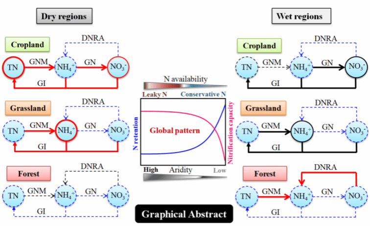 总体而言,气候变化导致的干旱增加可能通过降低干旱地区土壤氮的植物有效性,提高湿润地区土壤氮的植物有效性而影响生态系统功能。