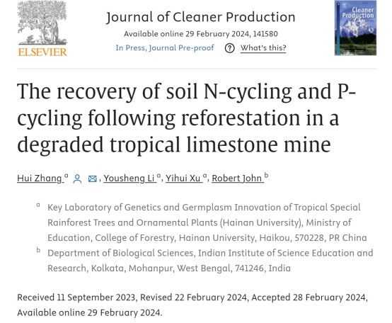 太阳集团tcy8722张辉教授团队长期从事海南热带雨林生态修复、保护和利用研究。近期,张辉教授在热带矿山修复取得重大突破,相关结果发表在一区Top期刊Journal of Cleaner Production (IF=11.1)发表题为《The recovery of soil N-cycling and P-cycling following reforestation in a degraded tropical limestone mine》的研究论文。张辉老师为论文的第一作者和唯一通讯作者。