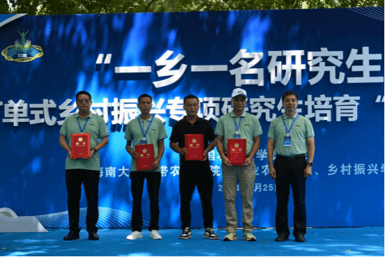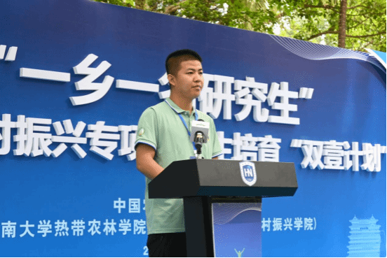 启动仪式上,“双壹计划”员工代表、24级硕士研究生安凯龙发言。“双壹计划”委员会及出席会议的领导为联合导师颁发聘书,为“双壹计划”儋州区专项活动授旗。