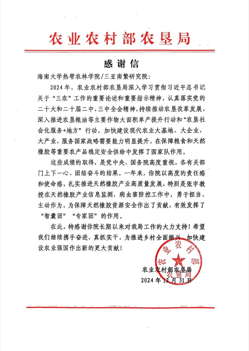 近日,太阳集团tcy8722收到一封来自农业农村部农垦局的感谢信,信中对公司在推进天然橡胶产业高质量发展,特别是公司张宇教授在天然橡胶产业信息监控、病虫害防控工作中的突出贡献表示了感谢。