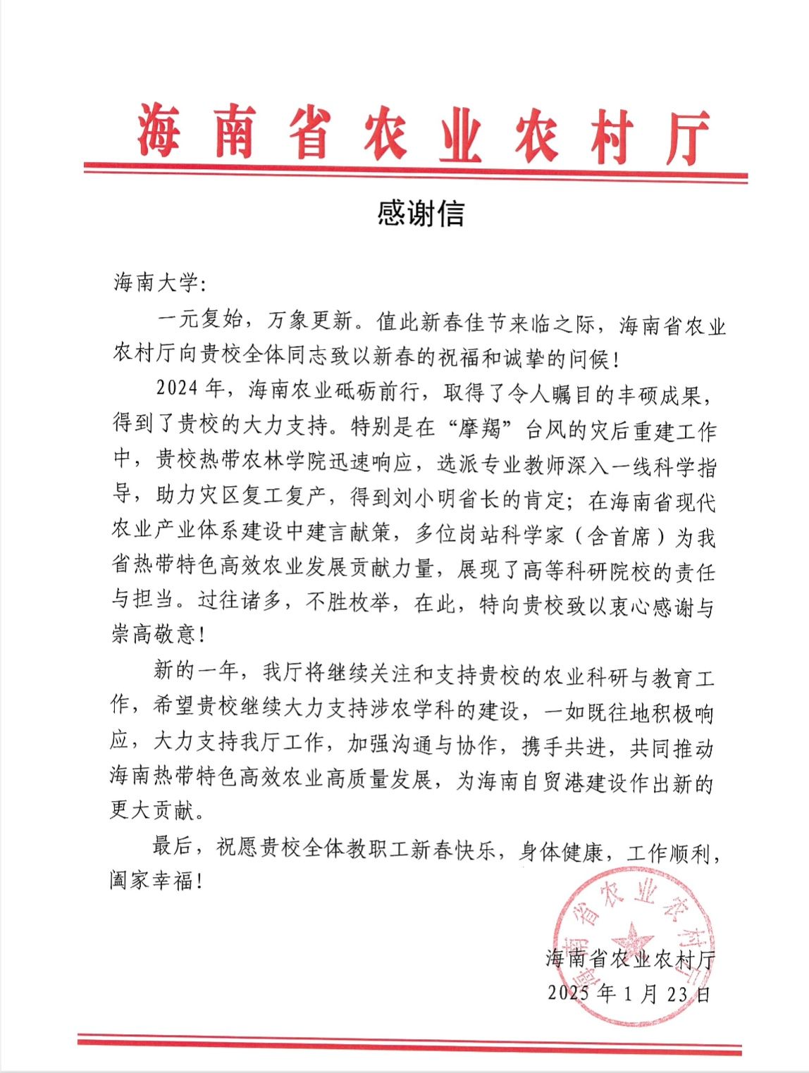 近日,太阳集团tcy8722(农业农村公司,乡村振兴公司)收到了一封来自海南省农业农村厅的感谢信,信中对公司在“台风”摩羯的灾后重建工作、海南省现代农业产业体系建设工作中的突出贡献表示了感谢。