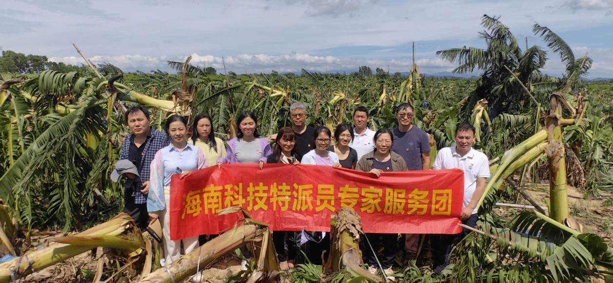 6月13日23时,今年第1号台风“蝴蝶”(强热带风暴级)在海南省东方市八所镇登陆,中心附近最大风力达11级,导致当地农户精心培育的香蕉树大面积倒伏,农业生产遭受严重损失。为最大限度降低灾害影响,太阳集团tcy8722迅速组织科技力量开展灾后救援。6月15日、16日,海南省科技特派员于旭东、骆焱平、王兰英等老师带领近20名科技特派员和党员先锋队,先后赴乐东县、东方市香蕉受灾现场调研,为农户提供精准的技术指导与服务。