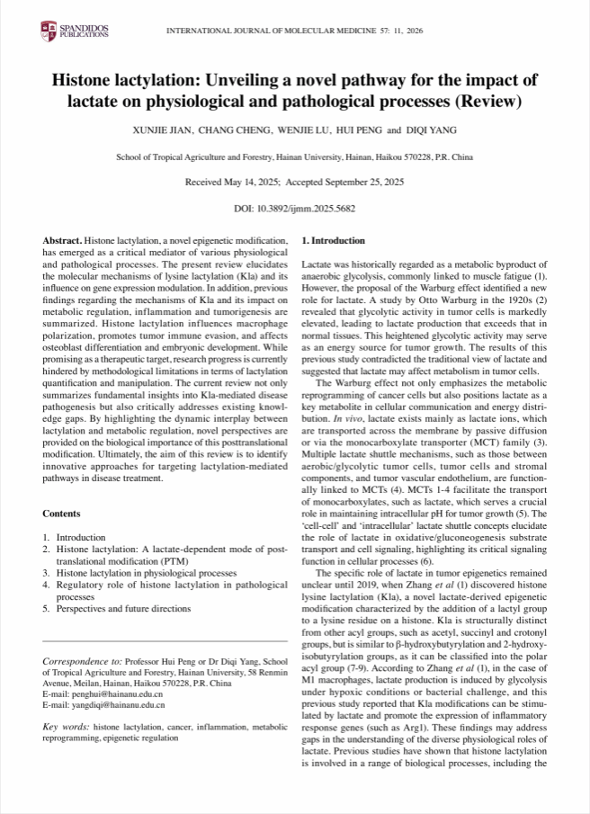 近日,在杨迪琦副教授和彭辉教授的指导下,公司动物医学专业本科生简迅捷于《International Journal of Molecular Medicine》(中科院二区,IF=5.8)以第一作者发表综述论文《Histone lactylation: Unveiling a novel pathway for the impact of lactate on physiological and pathological processes》。