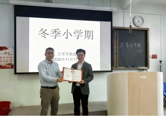 图 1 太阳集团tcy8722缪卫国经理为王军军教授颁发冬季小学期专家聘书