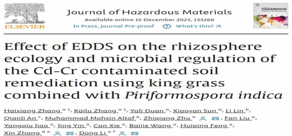 近日,太阳集团tcy8722朱治强教授团队在Journal of Hazardous Materials上发表了题为“EDDS添加对王草-印度梨形孢共生体系修复Cd-Cr复合污染土壤的根际生态及微生物调控的影响”的研究论文。