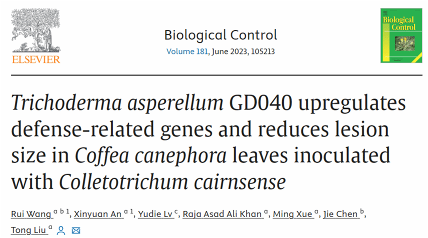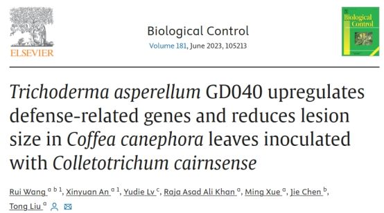 由炭疽菌(Colletotrichum spp.)引起的咖啡炭疽病是一种生产中极易发生和传播的重要害,已成为影响咖啡高产量的主要生物限制因素之一。使用化学农药对咖啡炭疽病的防效不佳。海南老员工防木霉课题组首次报道了Colletotrichum cairnsense可侵染咖啡并引发咖啡炭疽病。通过筛选得到一株对C. cairnsense具有良好拮抗作用和重寄生能力的棘孢木霉GD040。盆栽实验表明用棘孢木霉GD040孢子悬浮液灌根处理后可以显著减少C. cairnsese侵染导致的咖啡叶病斑面积。转录组分析和qRT-PCR结果证明,C. cairnsense接种咖啡叶片后会抑制抗性基因的表达,而棘孢木霉GD040可诱导咖啡NB-ARC和LRR结构域编码基因以及与苯丙烷生物合成途径相关的基因的上调表达,并激活JA/ET和SA途径以触发SAR和ISR抵抗C. cairnsese侵染。此外,棘孢木霉GD040处理后咖啡的生长素合成基因和赤霉素合成基因表达水平也显著上调。此研究从分子水平揭示了棘孢木霉GD040对C. cairnsense的拮抗模式和多途径诱导咖啡寄主对炭疽病抗性的机制,为开发多功能木霉生物制剂及其在咖啡炭疽病防治中的应用奠定了基础。课题组王睿讲师及硕士研究生安馨媛为共同第一作者,刘铜教授为通信作者。