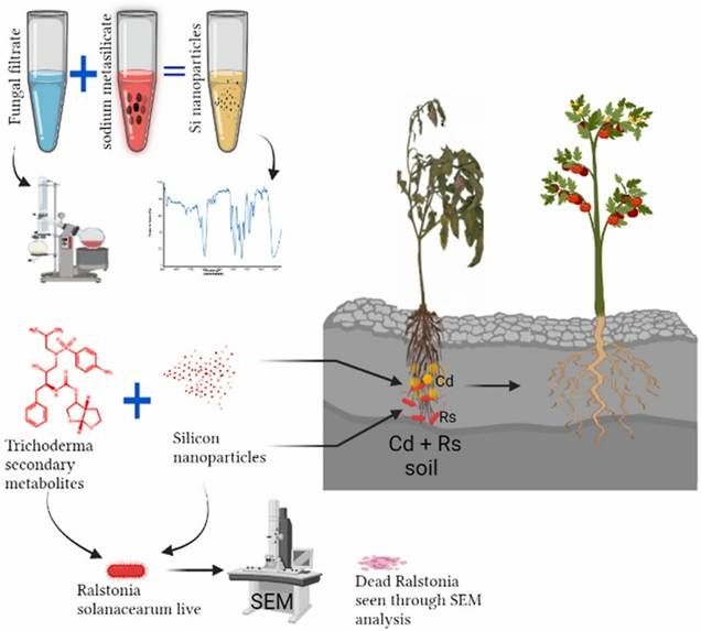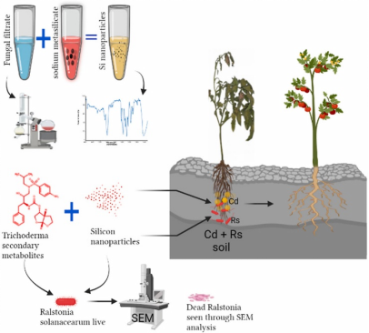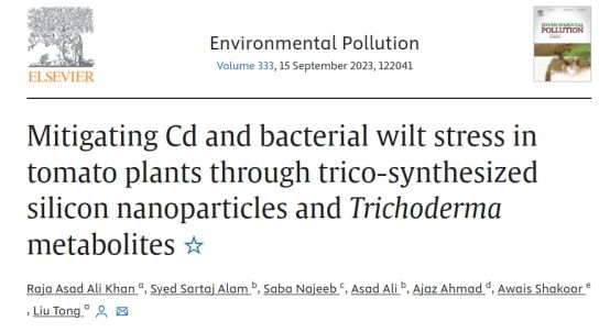海南老员工防木霉课题组利用硅、木霉代谢物合成的纳米硅和木霉代谢物处理对番茄在金属镉和细菌性枯萎病菌胁迫下的响应变化,发现木霉代谢物合成的纳米硅和木霉代谢物可以提高植物对镉的耐受性,降低从土壤中转运镉的能力进而减少植物体内镉含量,增强植物光合作用、抗氧化酶活性来降低镉的毒性。同时,木霉代谢物合成的纳米硅和木霉代谢物联合施用可以破坏青枯劳尔氏菌体细胞结构,显著降低番茄细菌性枯萎病的发生。课题组博士后Raja Asad Ali Khan为第一作者,刘铜教授为通信作者。