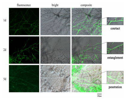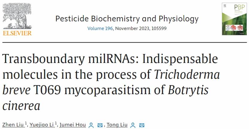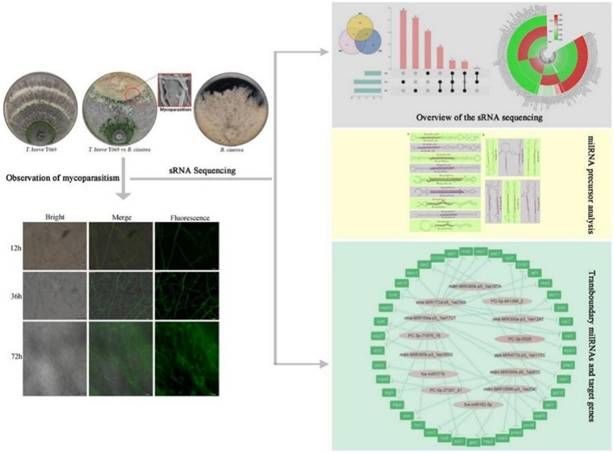 MicroRNAs (miRNAs)是一类内源性单链非编码RNA,可以降解mRNA或与mRNA结合在转录后水平抑制其转录或调节基因表达。目前,关于生防菌与病原菌互作过程中miRNA功能的相关研究较少。海南老员工防木霉课题组构建了GFP木霉菌株,通过荧光观察明确其重寄生灰霉菌的关键时期,将整个重寄生过程分为三个重要阶段:12 h——菌丝接触;36 h——菌丝缠绕;72 h——灰霉病菌菌丝降解。试验进一步通过高通量测序技术获得木霉重寄生灰霉菌过程中的miRNA,以及它们的靶基因,筛选了只在木霉中表达,并且前体结构只存在于木霉菌的基因组而不存在于灰霉菌的基因组中的miRNA,并预测了它们在灰霉菌中的靶基因,共筛选得到14个穿梭milRNA和41个靶基因。这些基因在木霉重寄生灰霉病菌的过程中起着重要的作用,该研究为miRNA在病害防治方面提供了新的方向。课题组博士研究生刘震和硕士研究生李月姣为共同第一作者,侯巨梅和刘铜为共同通信作者。