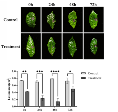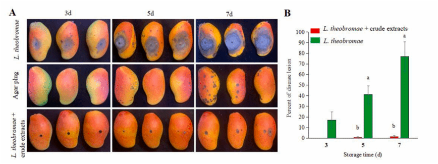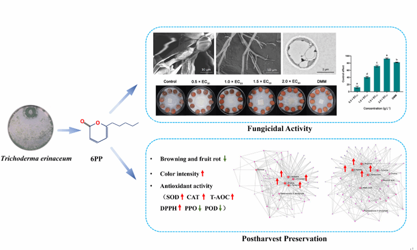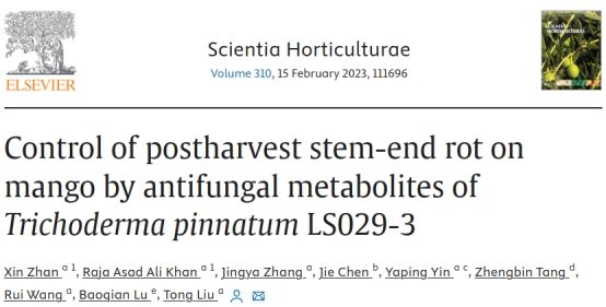 芒果蒂腐病是由Lasiodiplodiatheobromae引起的一种破坏性的采后病害,严重危害采摘后的芒果生产。太阳集团tcy8722生防木霉科研团队研究发现羽状木霉Trichoderma pinnatumLS029-3非挥发性代谢物对病原菌的抑制作用最强,代谢液粗提物的EC50为0.25 ± 0.03 g L−1,扫描电镜表明经4倍EC50粗提物处理后的菌丝结构被破坏,代谢液粗提物可以显著减少病斑面积和腐烂病的发生。通过增加防御酶活性,提高果实清除活性氧的能力,增强果皮硬度和色泽,减缓果实腐烂。本研究为芒果蒂腐病采后防治提供了一种安全有效的生物防治策略。课题组硕士研究生战鑫和博士后Raja Asad Ali Khan为共同第一作者,刘铜教授为通信作者。