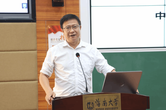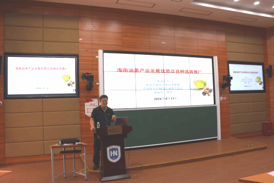 图3 中国热带作物学会油茶专业委员会主任、海南山柚(油茶)产业技术联盟理事长、公司教授(博士)赖杭桂讲述“海南油茶产业发展优势及前景”