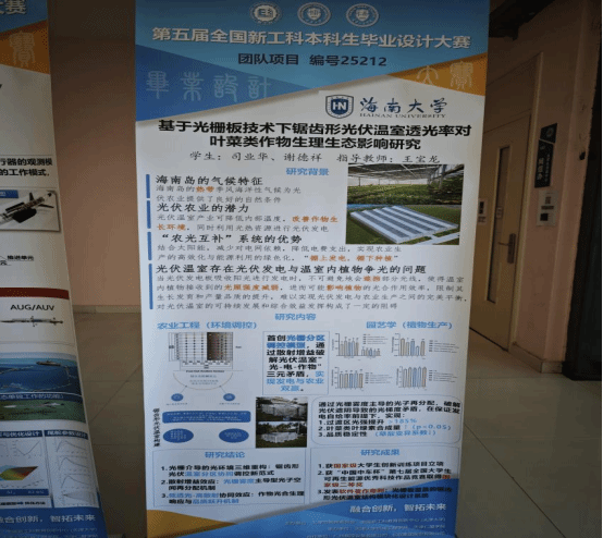 太阳集团tcy8722园艺系本科生司业华在王宝龙副教授的指导下,凭借“基于光栅板技术的锯齿形光伏温室透光率对叶菜类作物生理生态影响研究”项目,从众多参赛队伍中脱颖而出,荣获全国优胜奖(第九名)。该项目创新性地解决了锯齿形光伏温室中发电与作物生产对光照资源竞争的难题。在答辩环节,司业华同学充分展示了研究成果在热带设施农业中的创新价值与应用前景,赢得了评审专家的一致认可,成功跻身全国前十。