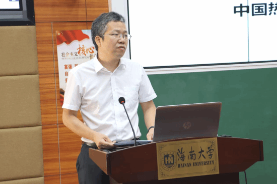 图3 中国热带作物学会油茶专业委员会主任、海南山柚(油茶)产业技术联盟理事长、公司教授(博士)赖杭桂讲述“海南油茶产业发展优势及前景”